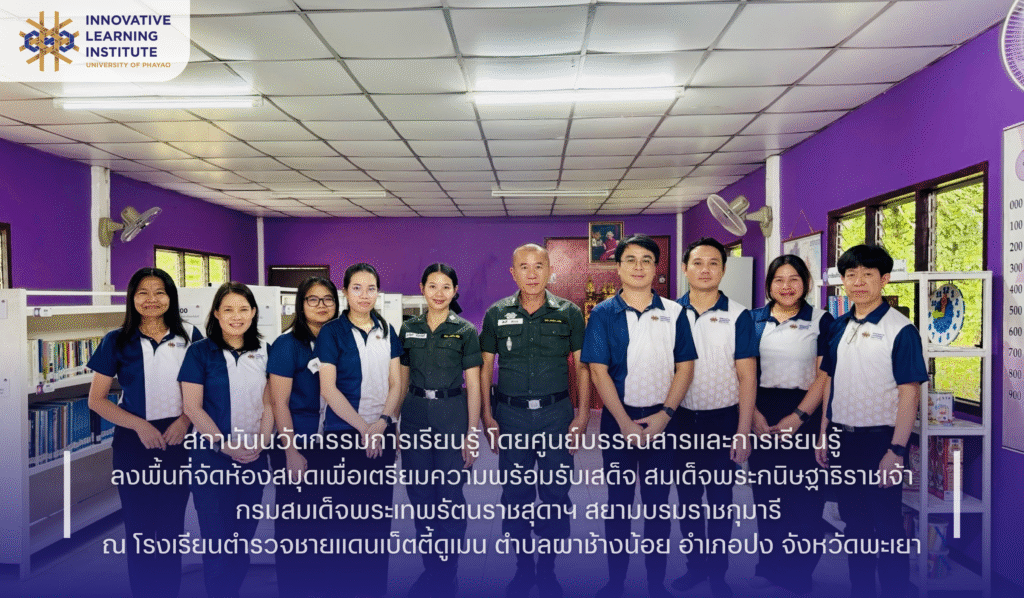 วันที่ 4 – 5 มิถุนายน 2568 สถาบันนวัตกรรมการเรียนรู้ มหาวิทยาลัยพะเยา โดย ผู้ช่วยศาสตราจารย์ ดร.น้ำเงิน จันทรมณี ผู้อำนวยการ สถาบันนวัตกรรมการเรียนรู้ ได้มอบหมายให้ นางสาววันเพ็ญ ตันจันทร์กูล ผู้อำนวยการศูนย์บรรณสารและการเรียนรู้ หัวหน้างาน และบุคลากร ลงพื้นที่จัดห้องสมุดเพื่อเตรียมความพร้อมรับเสด็จ สมเด็จพระกนิษฐาธิราชเจ้า กรมสมเด็จพระเทพรัตนราชสุดาฯ สยามบรมราชกุมารี ระหว่างวันที่ 17 – 19 มิถุนายน 2568 ณ โรงเรียนตำรวจชายแดนเบ็ตตี้ดูเมน ตำบลผาช้างน้อย อำเภอปง จังหวัดพะเยา โดยได้ดำเนินการจัดเตรียมระบบบริหารจัดการห้องสมุด พื้นที่สำหรับการให้บริการและพื้นที่ส่งเสริมการเรียนรู้ จัดหมวดหมู่หนังสือ จัดชั้นหนังสือและนำหนังสือขึ้นชั้น จำนวน 2,000 รายการ และจัดเตรียมกิจกรรมส่งเสริมการเรียนรู้ด้วยหนังสือทำมือสำหรับนักเรียน