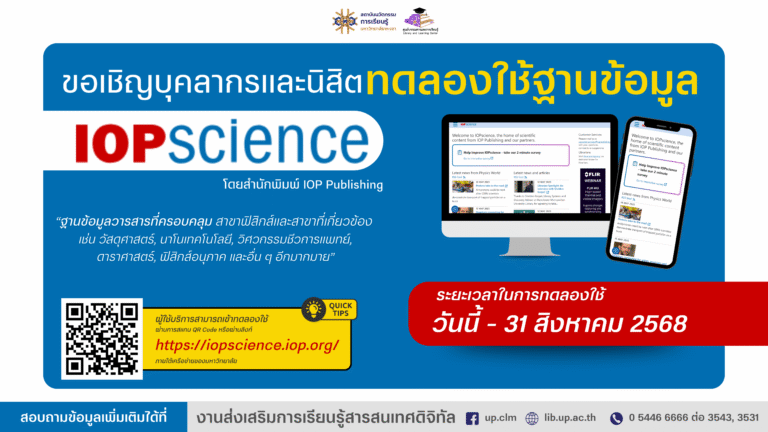 สถาบันนวัตกรรมการเรียนรู้ โดยศูนย์บรรณสารและการเรียนรู้ ขอเชิญชวนบุคลากร และนิสิตมหาวิทยาลัยพะเยา ทดลองใช้งานฐานข้อมูลของ IOPscience โดยสำนักพิมพ์ IOP Publishing ซึ่งเป็นฐานข้อมูลวารสารที่ครอบคลุมสาขาฟิสิกส์และสาขาที่เกี่ยวข้อง เช่น วัสดุศาสตร์, นาโนเทคโนโลยี, วิศวกรรมชีวการแพทย์, ดาราศาสตร์, …